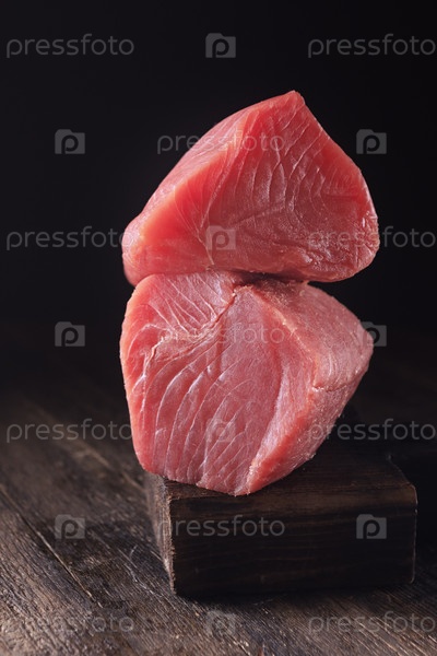 Два больших куска свежего тунца. Тунец для стейка. Свежая рыба. Здоровое и питательное блюдо. Природные омега. Темный фон
