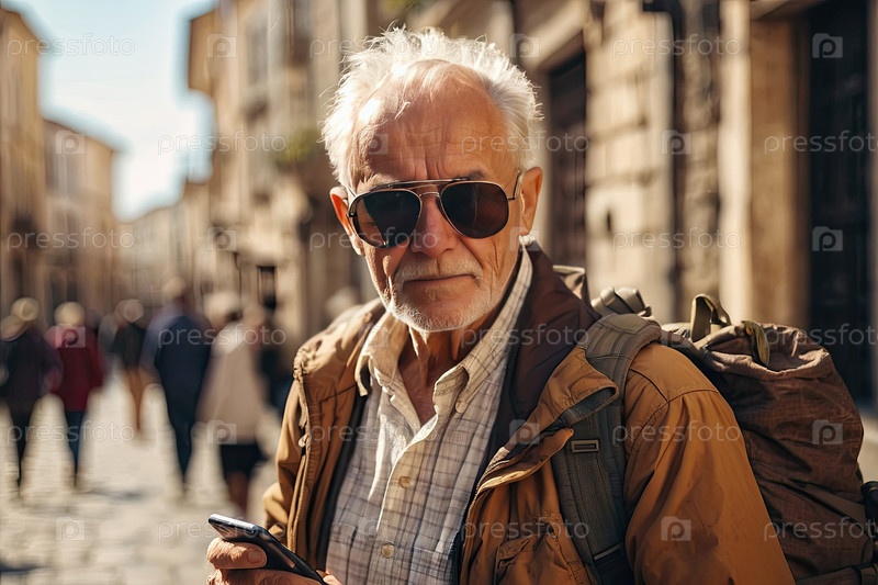 Пожилой мужчина с рюкзаком, седыми волосами, солнцезащитными очками, коричневой курткой стоит на старой европейской улице. одиночное путешествие, навигационные проблемы, культурное открытие. отлично подходит для туристических объявлений, ориентации