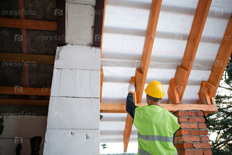 Строитель устанавливает изоляционный слой между деревянными бревнами крыши, современное строительство домов, тщательное обращение с энергоэффективной кровлей