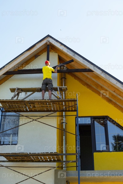 Строитель в желтом тщательно подбирает деревянную отделку к новой структуре крыши, яркий фасад, использование уровня инструмента, наружная отделка на стадии строительства, профессиональный шаг