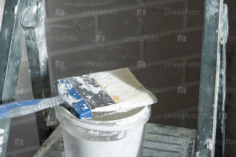 Лестница с ведрой и роликом для краски, продолжающаяся покраска стен, отделка интерьера, инструменты по ремонту дома, подготовка оформления комнаты, поверхностная работа