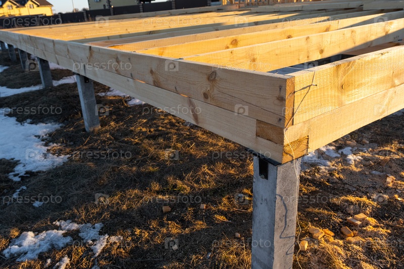 Ближайшее изображение фундамента винтовой свай, установка деревянного подпольного покрытия, будущий каркасный дом, внешняя структура, поддержка земли здания, первый этап строительной фазы