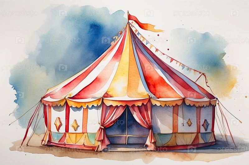 Водяной цвет красно-желтой цирковой палатки купол ? рукописная иллюстрация для плакатов, билетов, флаеров, вечеринок, фестивалей, детских книг, приносит праздник радость, приключения, ностальгию