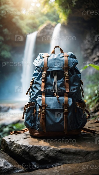 Вертикальный снимок туристического рюкзака у высокого водопада в зеленом тропическом лесу, путешествия по походам, приключенческий туризм и спорт, оборудование для исследователей на открытом воздухе, активный отдых