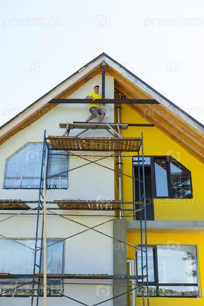 Фасад дома с желтыми деталями, леса для мастера, чтобы работать над отделкой крыши, личная безопасность, улучшение жилища в процессе, аккуратная архитектура