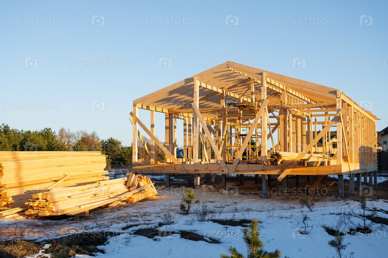 Строительство дома с деревянной рамой, сцена для строительства из древесины, фундаментные свайки, внешний вид, здание на месте, проект нового жилья, монтажные работы