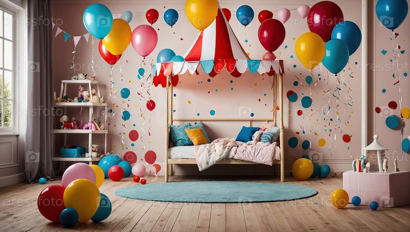 Рождественская комната цирка с бантингом ? креативный декор, воздушные шары, полосатая палатка, праздничная обстановка, радостная атмосфера, для детского торжества и тематических мероприятий