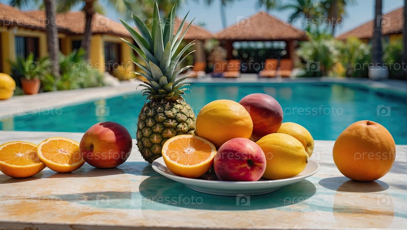 Блюдо для завтрака с киви, апельсином, манго в бассейне, питание летнего отеля, промо-пропаганда еды "все включено", меню тропического туризма, утренний баннер здоровья, коммерческое использование