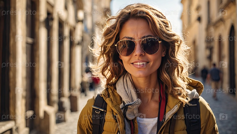 Молодая женщина-туристка, длинные волнистые блондинки, солнцезащитные очки, коричневая трекинг куртка, оранжевый городской дневник, одиночное путешествие, исследование исторической улицы