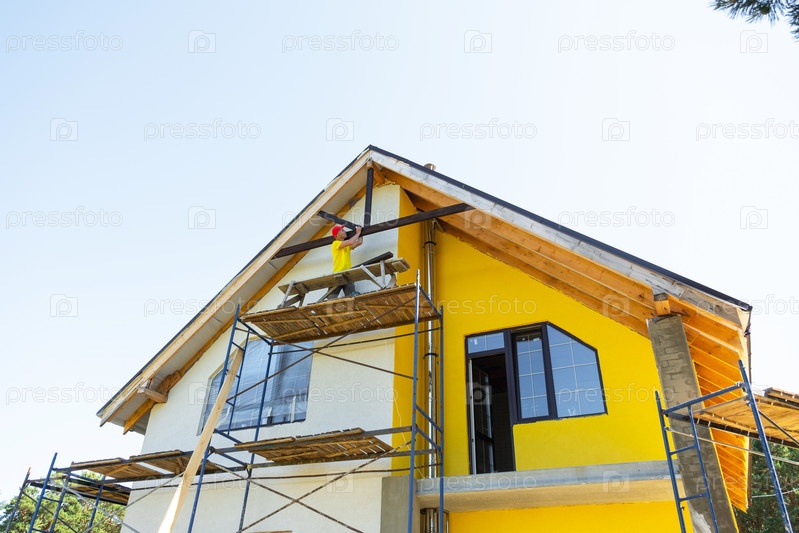 Человек встает на колени на лесомашины, затягивая болты на деревянную структуру передней двери, внешнее строительство дома, видимый фасад и деревянные элементы, улучшение жилища продолжается