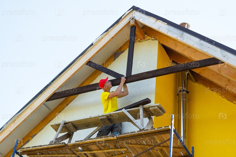 Работник проверяет выравнивание декоративных балкончиков на фасаде дома, висящих с лесовки, современный желтый дом, мастерство и внимание к деталям