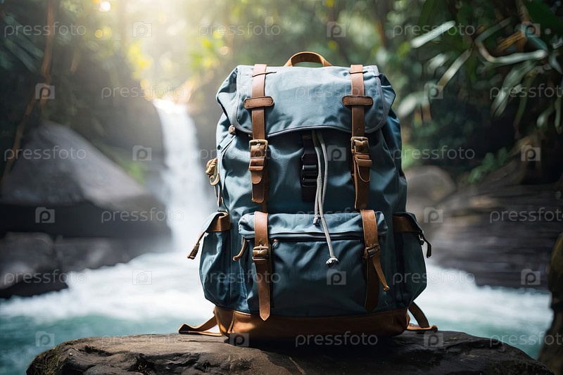 Большой рюкзак для горных походов на камне, яркий дневной свет, водопад, путешествия в поход, туризм, спортивные приключения, здоровый образ жизни, природная активность, фитнес, промо-оборудование