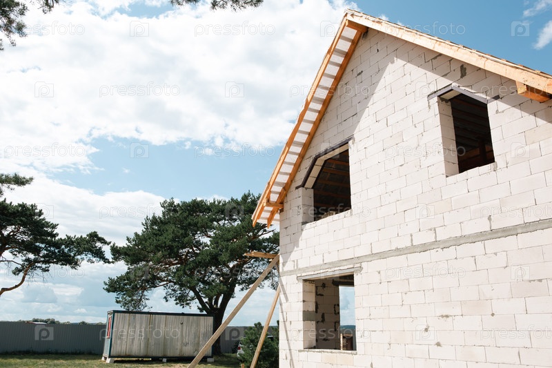 Перспективный вид нового дома во время сборки системы крыши, решетки и зазоры формируют современную силуэт Евростиля, кирпичную стену и белый блок