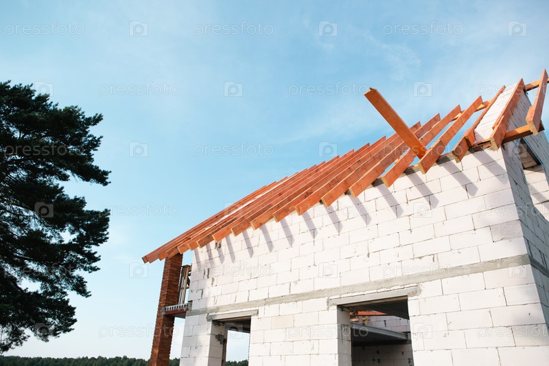 Современный дом с установкой деревянной крыши, кирпичными и блочными стенами, эволюцией стропильной системы, здание покрыто жилищным страхованием и кредитом на строительство