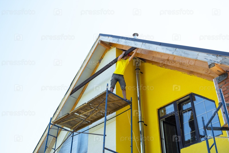 Склонный вид желтого дома со скелетами, рабочий готовит верхнюю балки для фиксации, активные детали строительства дома, дневная сцена