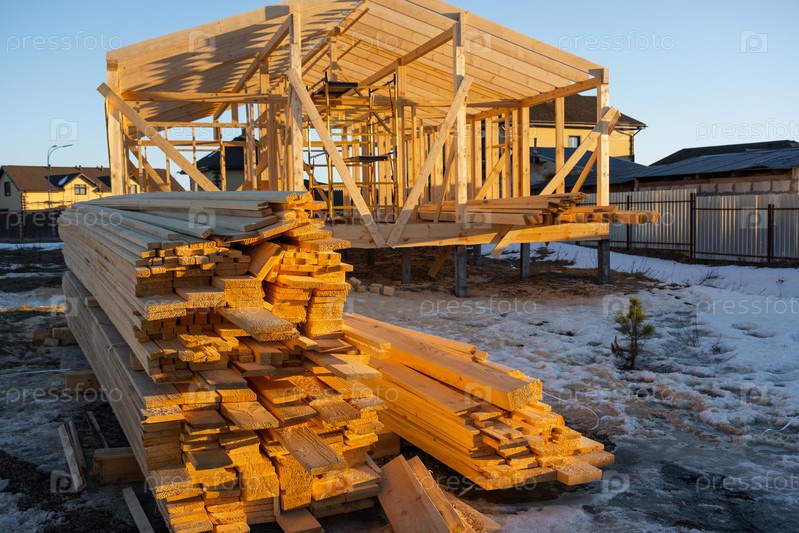 Доставка деревянных балки для каркаса дома, материала на строительной площадке, подготовки фундамента, элементов поддержки из древесины, столярного снабжения, организации проекта