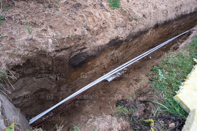 Траншея для установки водопроводных труб, копания, подземного трубопровода, изоляции трубопроводов, прокладки сантехники, заземления системы водоснабжения, работ на площадке