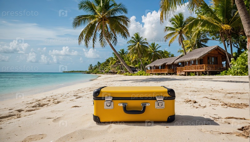 Классический багаж на песчаном тропическом пляже, пальмы, голубая вода, мирная сцена прибытия, элегантная реклама туристического агентства, предложение туристского продукта, премиальный макет баннера, копирайтинг для сделок