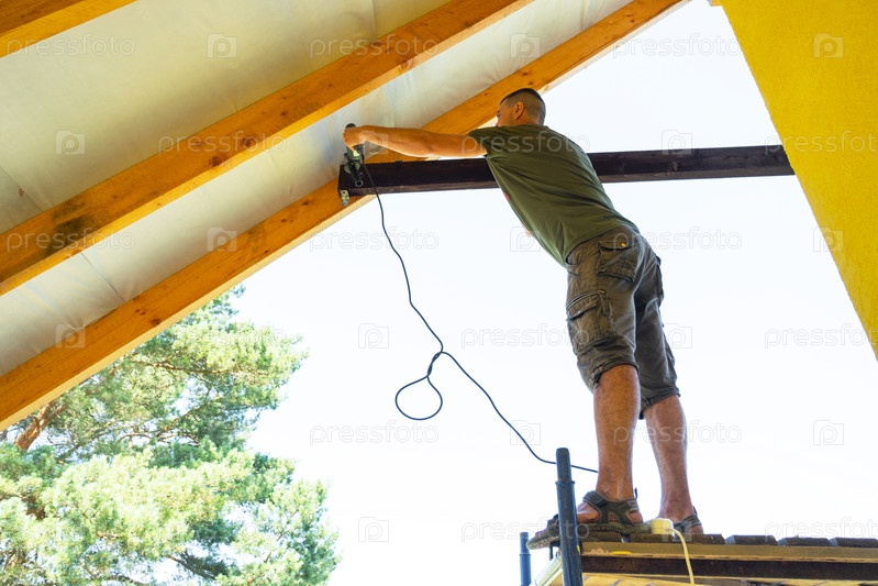 Человек с шнуром фиксирует черную деревянную балки внутри габеля, крупный план рук и древесины, современная желтая стена, задачи самостоятельного строительства