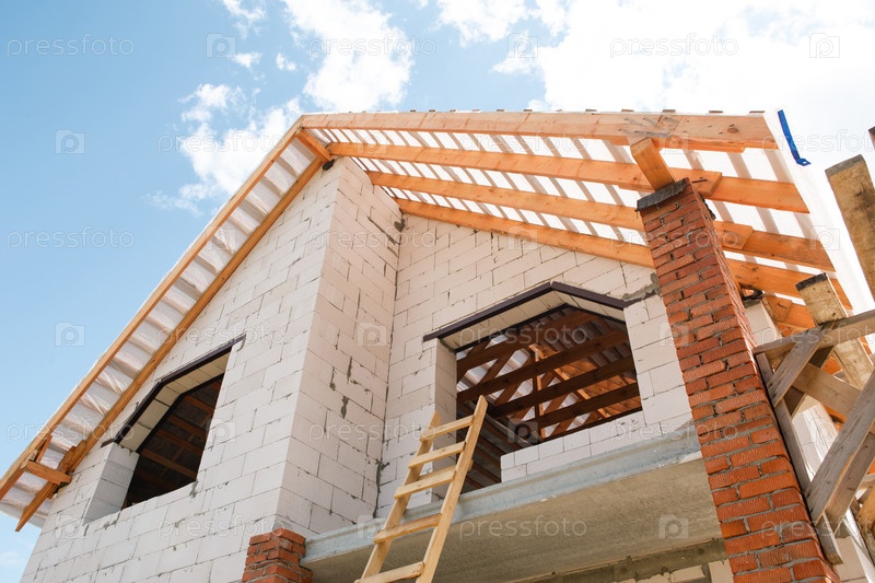 Ближайшее изображение дома в европейском стиле, открытая крыша с рафтовыми и задержными креплениями, видимые строительные материалы и инструменты, монтаж крыши продолжается