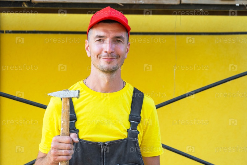 Молодой мастер в красной шляпе, держащий молоток, строительство дома, плотничество, гвоздь, ремонтные работы, частный бизнес, услуги DIY, звонок на месте, ремесла