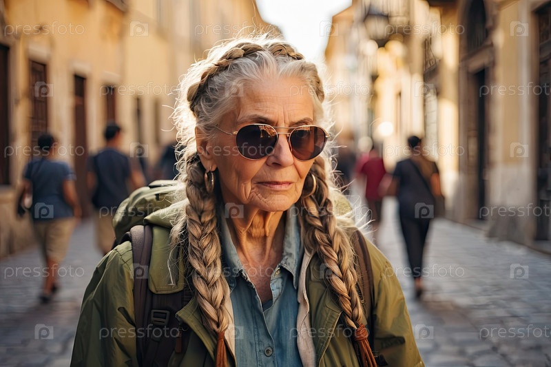 Активная пожилая женщина, плетеные волосы, очки, легкая куртка, туристический рюкзак, на мощеной городской улице, сольное приключение, туристская навигация в иностранном городе.Полезно для технологий путешествий, справочников, ориентации