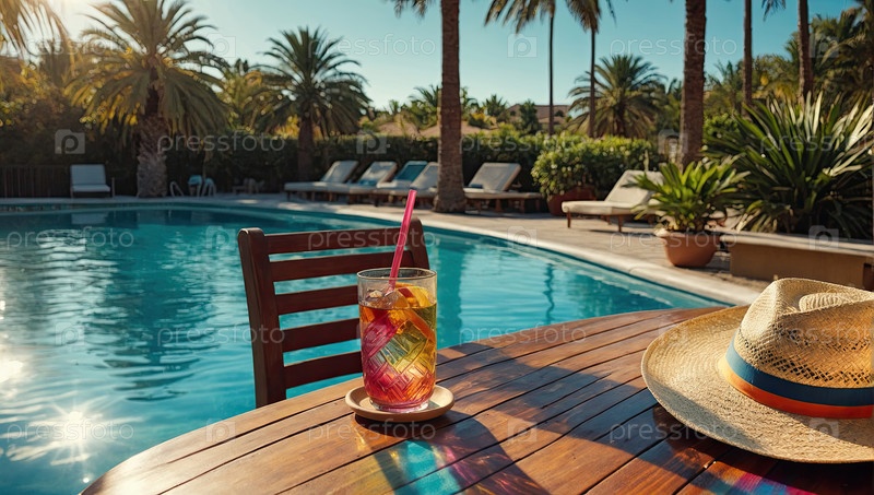 Бокал сока и соломенная шляпа на столе у бассейна, все включено в курортный отдых, безопасность летом, комфортные каникулы, промо-пакет путешествий