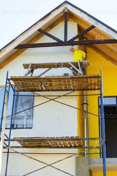 Строитель проверяет завершенный дизайн деревянной двери, стенды на внешнем лесоматериале, современный желтый фасад, достижение мастерства, риск в высоте