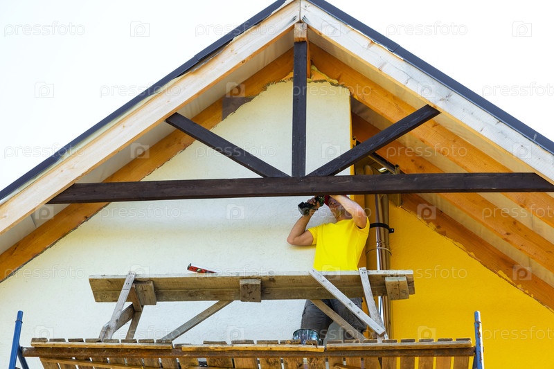 Профессионал по строительству закрепляет новую балку на высоком фронтоне, видимую изоляцию и боковые ограждения, внешнюю отделку дома, инструменты в руках, оборудование безопасности