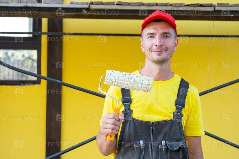 Молодой мастер-ремонтник с роликом краски, ремонт дома, покраска стен, частный бизнес DIY, комплект инструментов, визит уборщика, консультация по улучшению жилища клиента