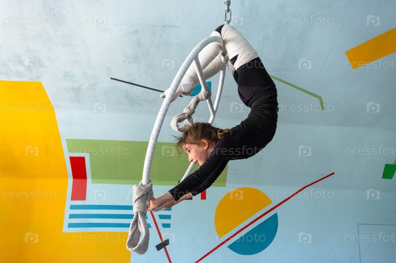 Молодая девушка, растягивающаяся на воздушном кольце, класс цирковой акробатики, безопасность обеспечивается эластичными обертками на ногах, спортивная практика