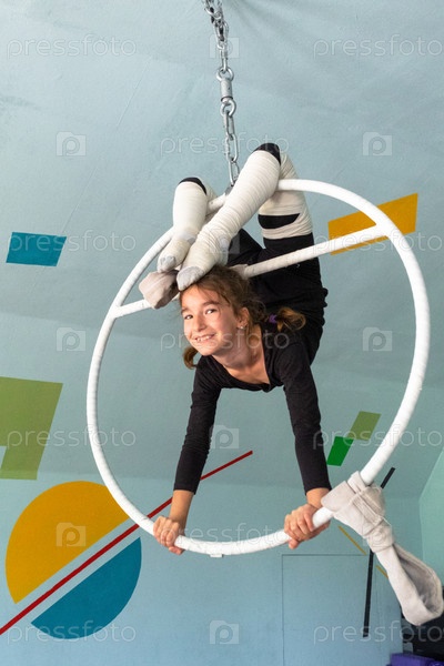 Молодая спортсменка в черной спортивной одежде, выполняющая воздушный обручальный трюк, цирковые каскады, безопасное спортивное окружение, защищенное покрытиями