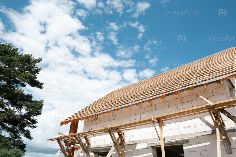 Современный дом с установленной деревянной стропильной системой на толстых каменных стенах, активная крыша при ярком дневном свете, видимый внешний дизайн