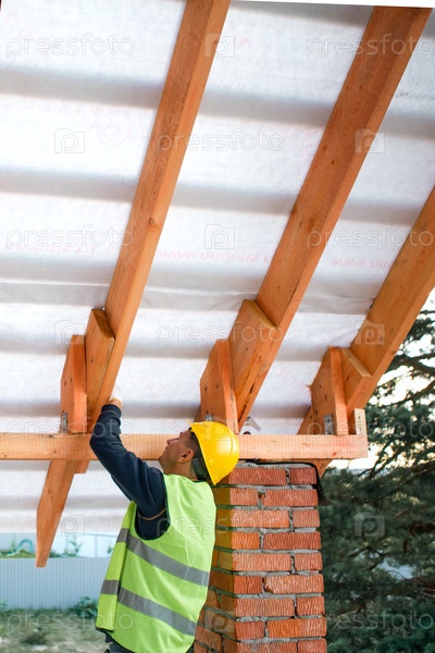 Работник устанавливает диагональную плотину для новой конструкции крыши, используя ручные инструменты, выделенный процесс прикрепления задержки, современное строительство деревянного дома