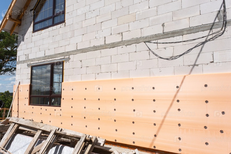 Изоляция дома, установка пенопластов, тепловое улучшение фасада, строительная технология, энергосберегающая стена, внешний ремонт, клей и фиксация