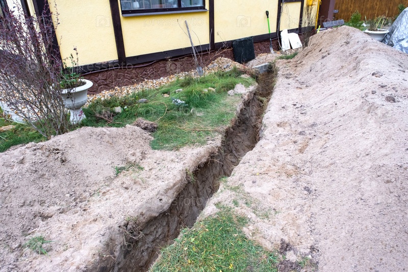 Ямка, содержащая изолированные водопроводные трубы, грунтовые работы, прокладку сантехники, строительство коммунальных услуг, защиту, ремонт на участке, заполнение, установку, улучшение