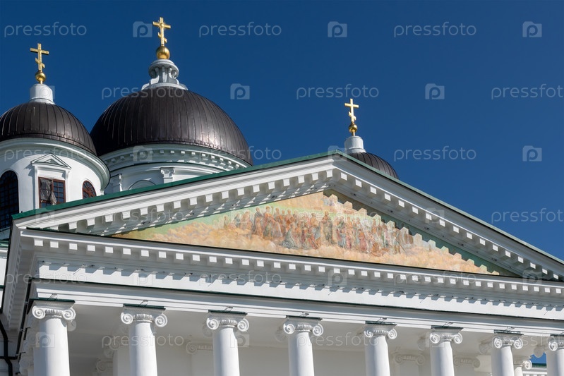 Величественный собор Воскресения Христова с куполами на фоне голубого неба в Арзамасе, окруженный пышными садами и дорожками, сочетает архитектурную красоту со спокойным городским ландшафтом. Россия, Арзамас