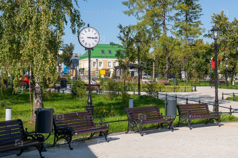 Вид на Парк культуры и отдыха, площадь Монастырский садик в летний день. Россия, Арзамас