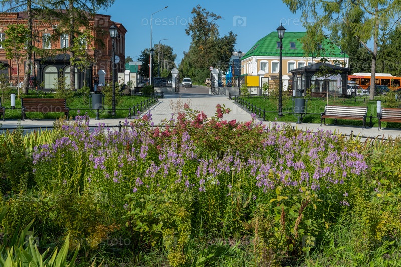 Вид на Парк культуры и отдыха, площадь Монастырский садик в летний день. Россия, Арзамас