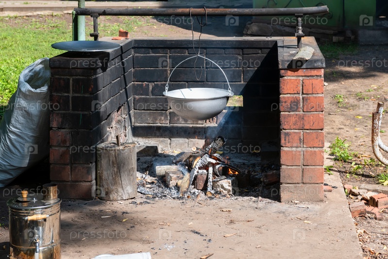 Приготовление пищи на костре. Открытый очаг, костер и посуда в специально отведенном месте на открытом воздухе