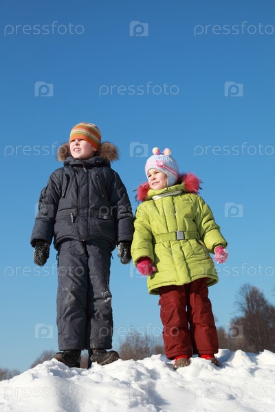 Маленькая девочка в зеленой куртке и мальчик, стоящий на снегу
