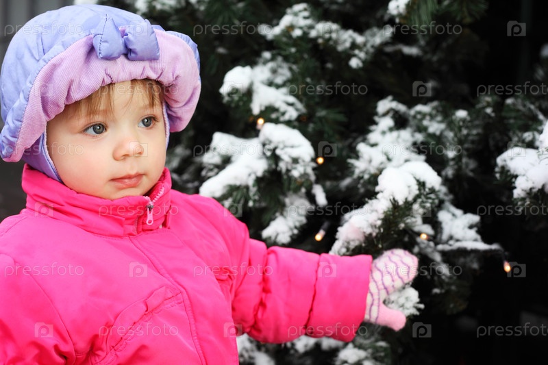 Красивая девочка в розовом куртке стоит возле зеленого дерева с