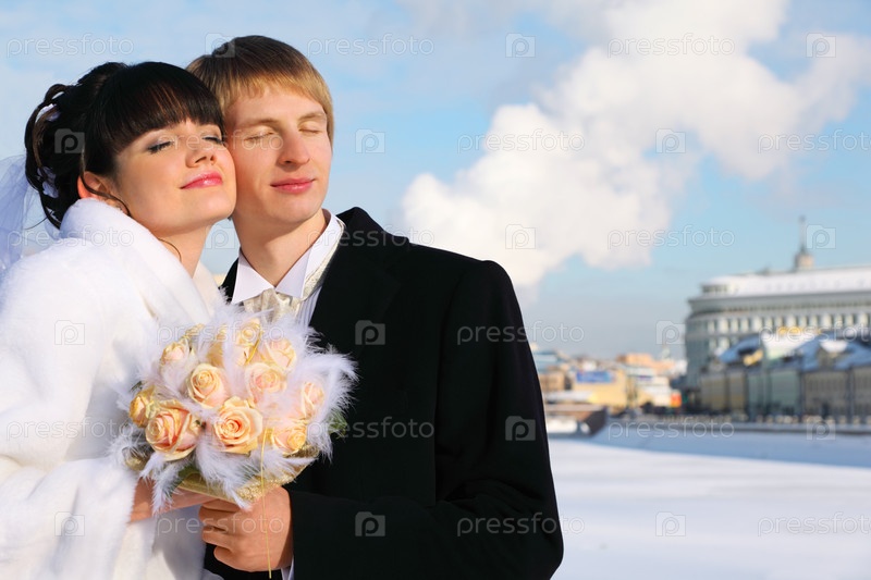 Обнимая улыбающихся жениха и невесту с закрытыми глазами, держа в руках букет