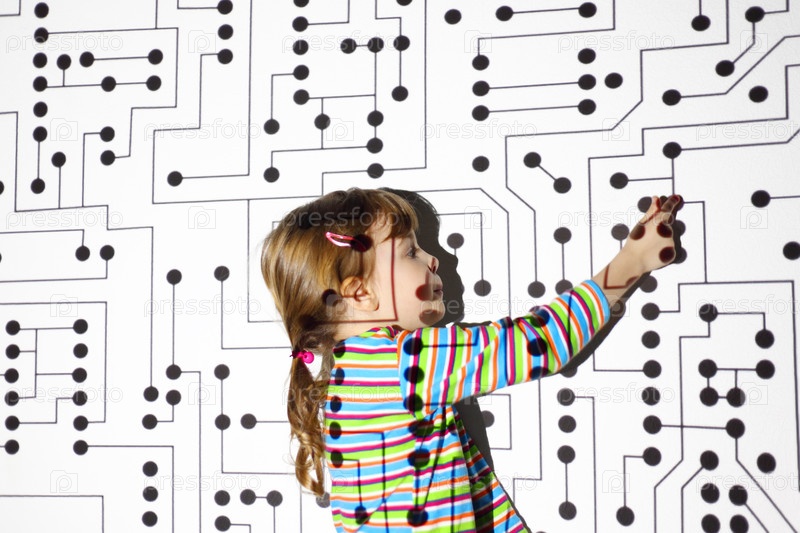 Маленькая девочка в полосатой рубашке показывает на черном круге на трассе, доске,