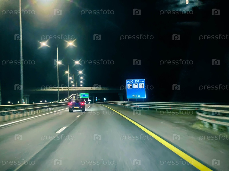 Вид автомагистрали в вечернее время с рядами уличных фонарей и разметкой