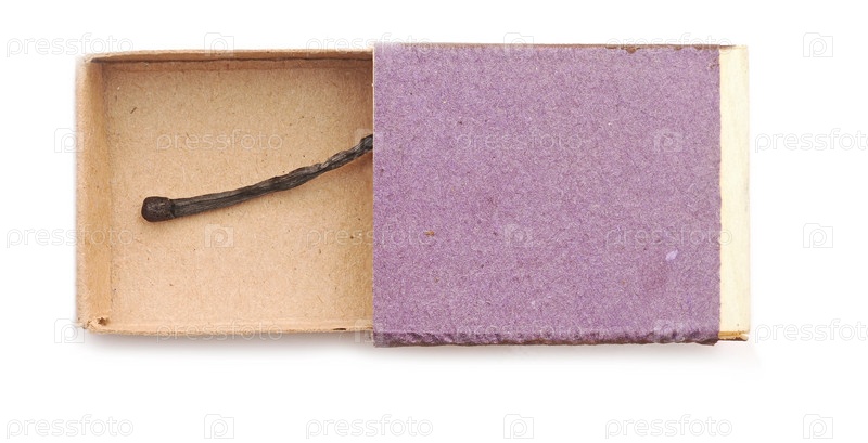 Спичечный коробок с сожженной спичкой, изолированный на белом фоне