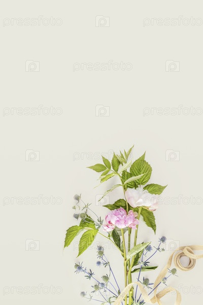 Нежный весенний цветок с розовыми цветами, воздушные дикие цветы и свежие зеленые ветви на светлом фоне со копировальным пространством. Вертикальный цветочный фон для поздравительной открытки, приглашения и сезонного брендинга