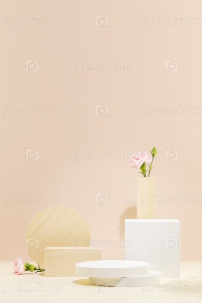 Пустой косметический подиум с весенними цветами на мягком бежевом фоне