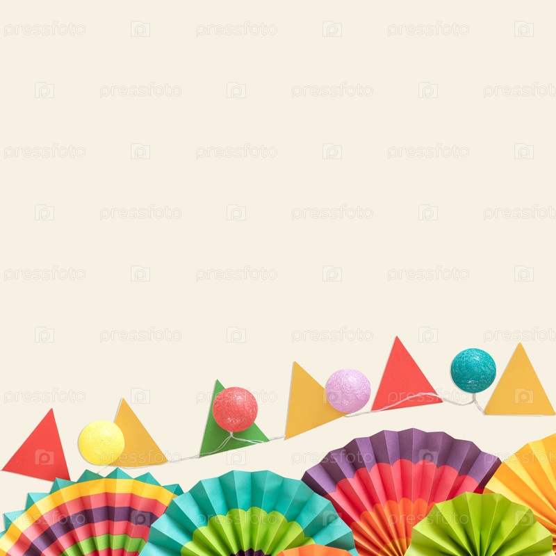Цветные бумажные вентиляторы, яркие геометрические флаги и праздничные огни на бежевом фоне с копировальным пространством Веселый мексиканский праздничный фон для поздравления Cinco de Mayo, промо-партии и дизайн мероприятий