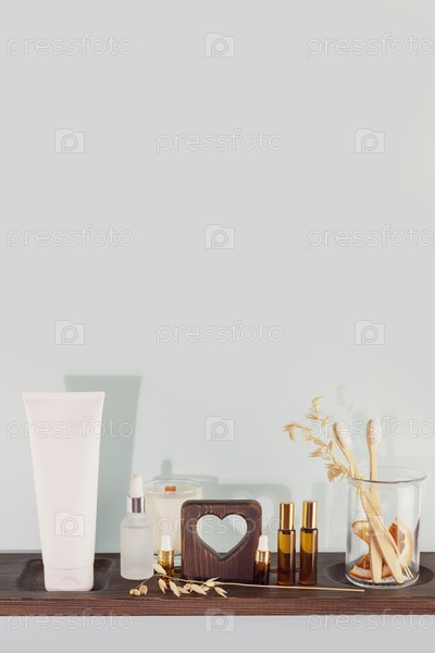 Косметические изделия расположены на полке с синим фоном и копировальным пространством выше